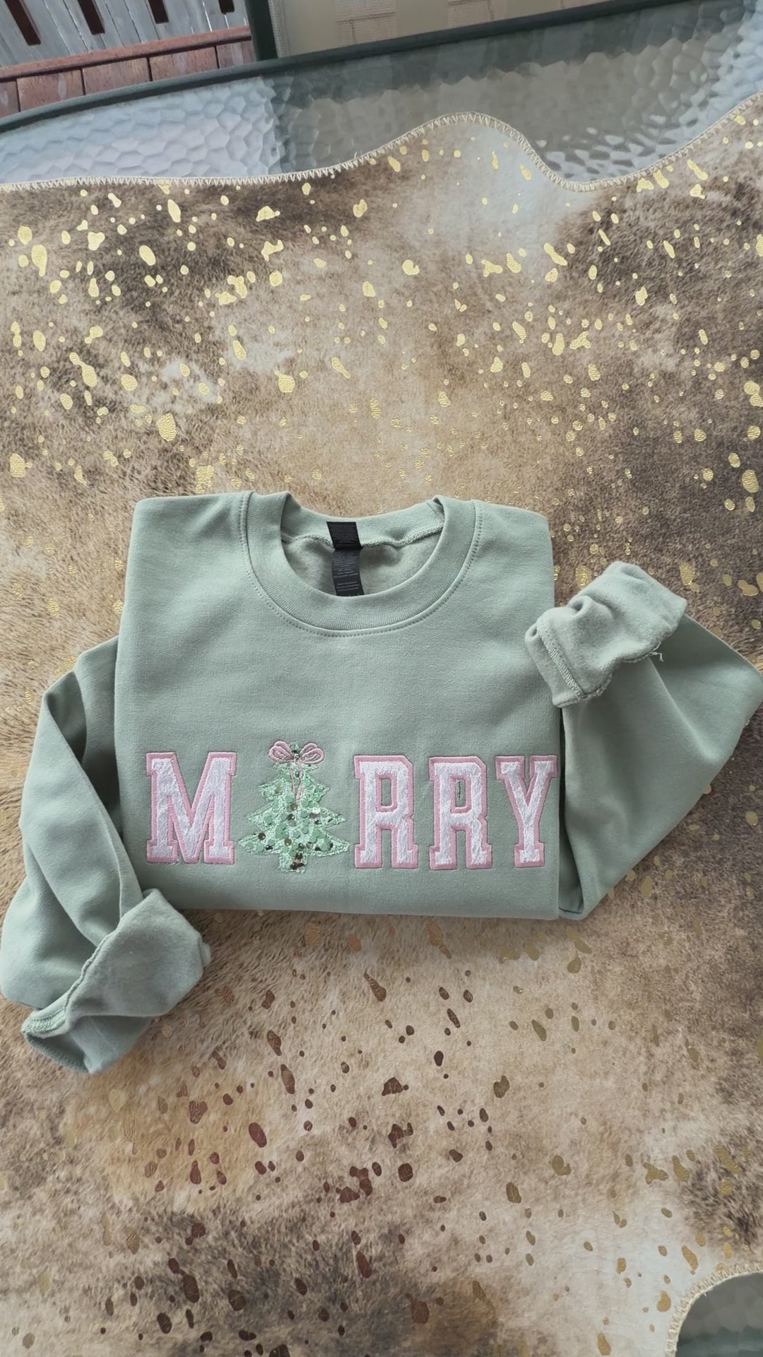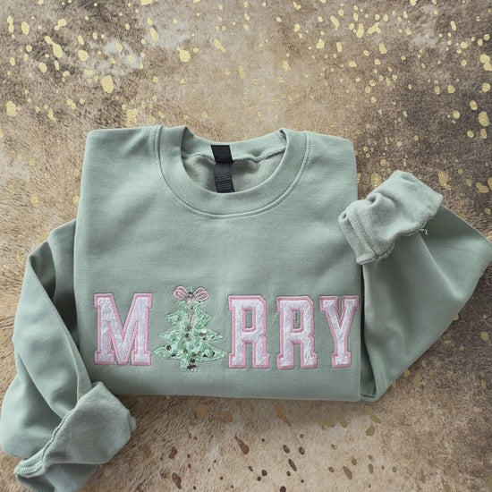 Embroidered Sweatshirt -MERRY Sequin tree and velvet pink letters