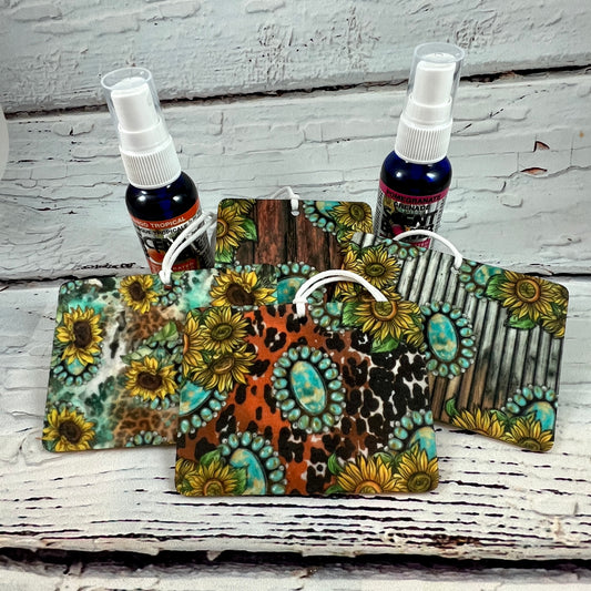Air freshener Barn Wood, Turquoise and Sunflowers Design and 1 fl oz Scent Bomb