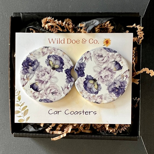 Ceramic car coaster set - Blue violet Peonies