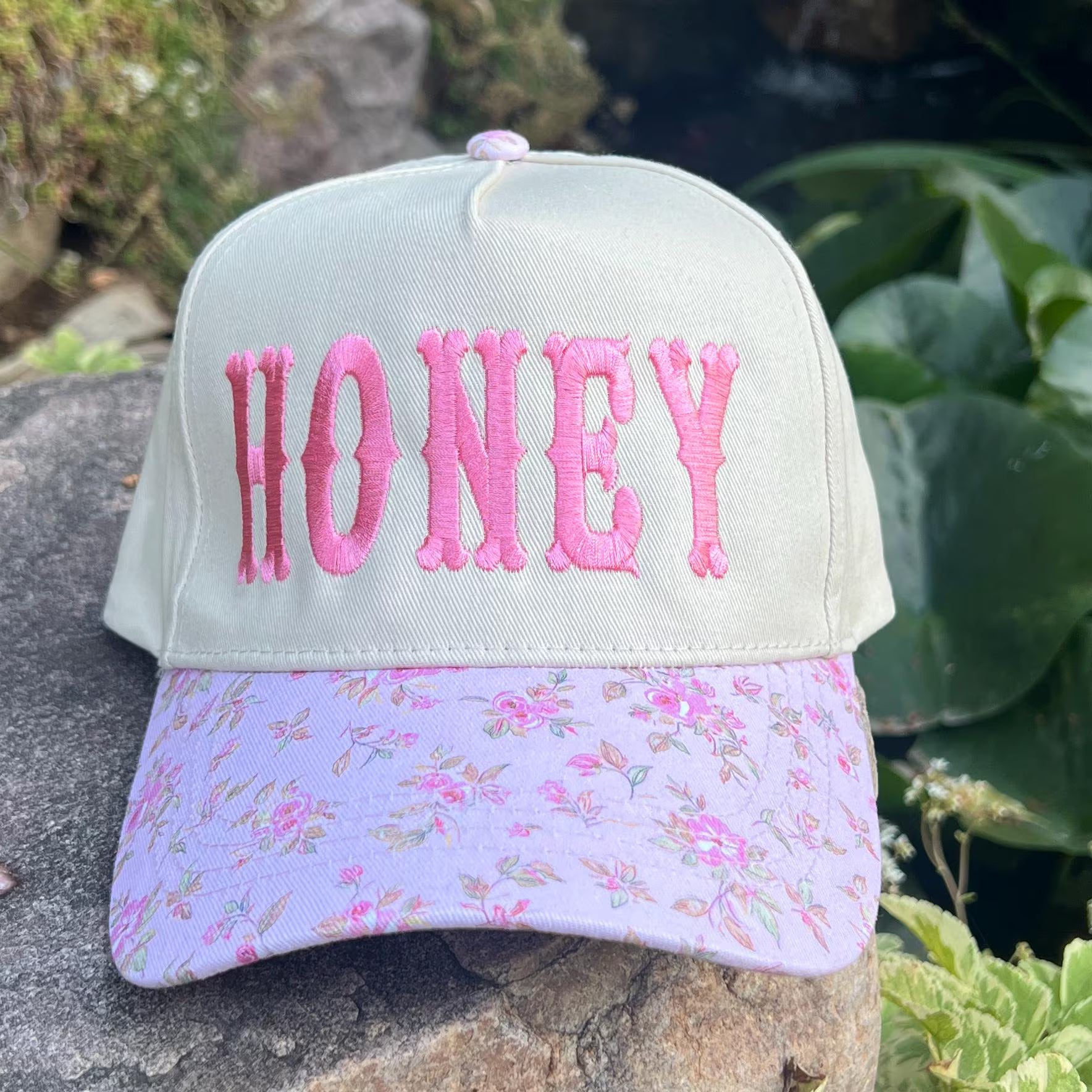 Floral pink brim with HONEY embroidered logo. Vintage two tone trucker hat.