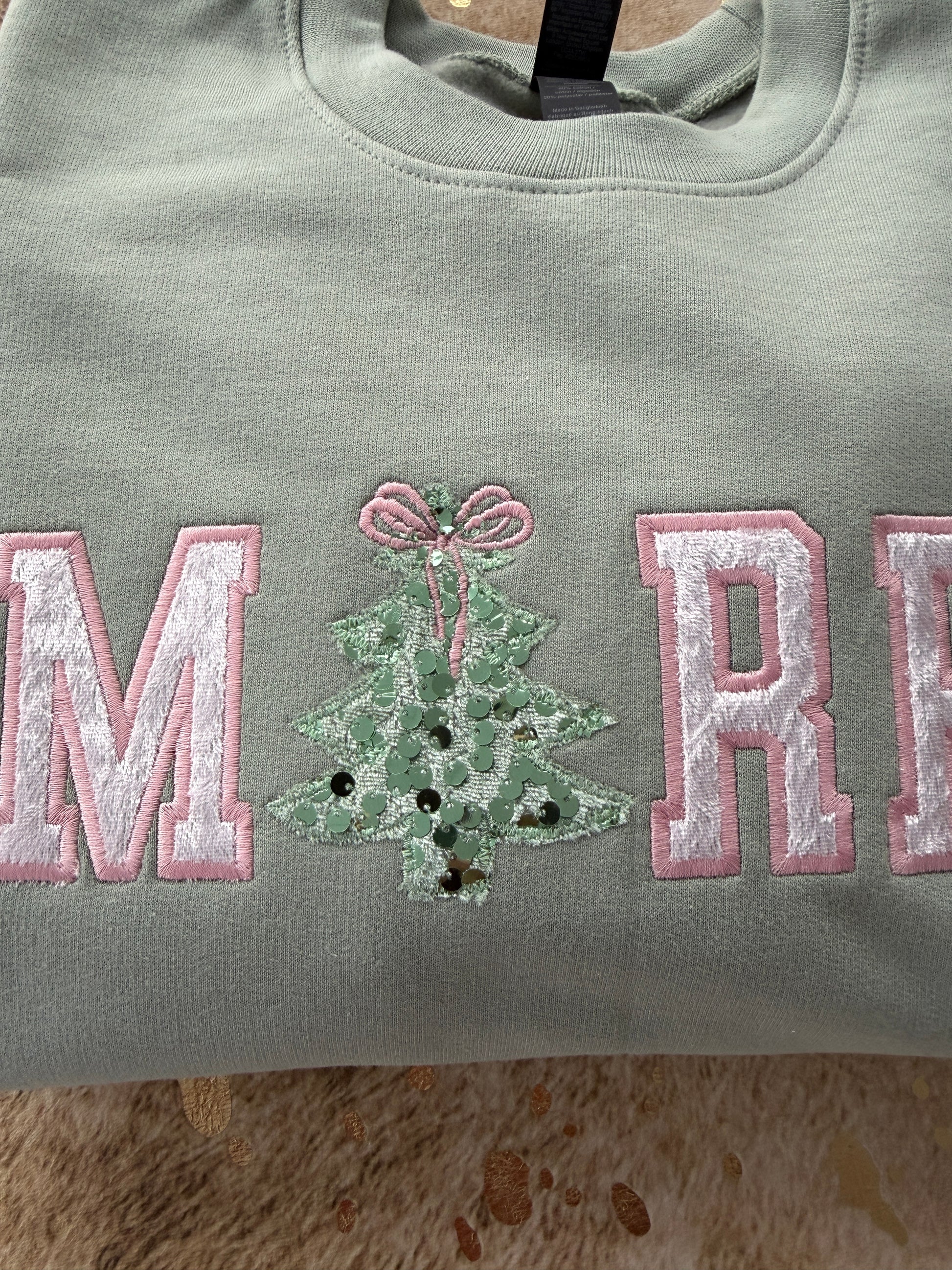 Embroidered Sweatshirt -MERRY Sequin tree and velvet pink letters